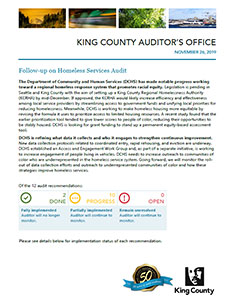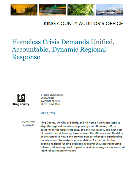 King County and the City of Seattle declared homelessness a state of emergency in 2015. Since then the number of people experiencing homelessness has continued to rise. In January 2017, the nationally mandated one-night count found 11,643 people experiencing homelessness. Committed to making homelessness rare, brief, and one time, King County is serving more people than ever. However, as homelessness becomes more common, waits for housing get longer. This audit explores several aspects of the regional homeless system, including how it is organized and how people enter and exit homelessness.