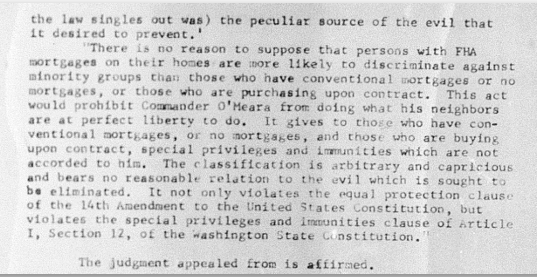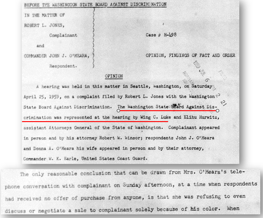 The Washington Board Against Discrimination took up the case and ordered the O’Meara family to sell their home to Mr. Jones. Assistant Attorney General Wing Luke later represented the Board in the Washington Supreme Court.