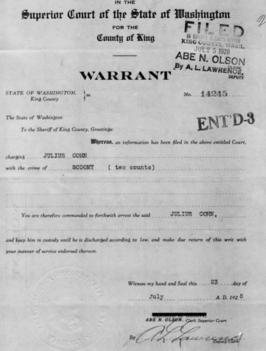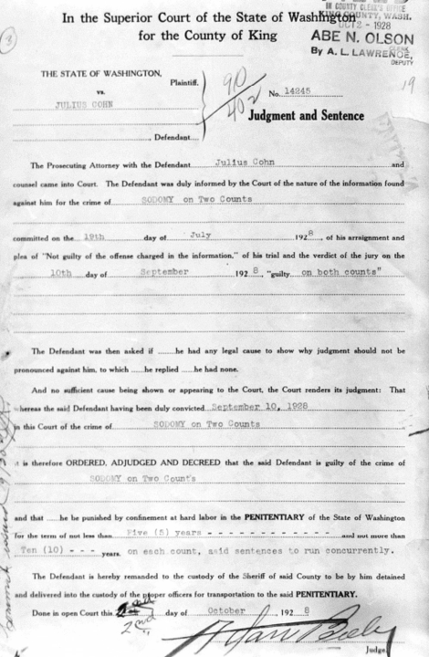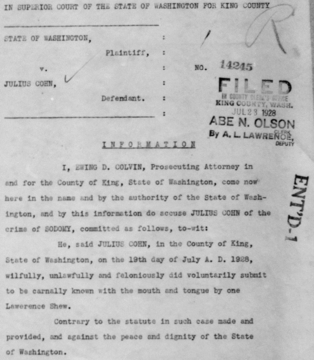 In 1928, Julius Cohn, a Jewish man, was charged with sodomy in King County Superior Court.