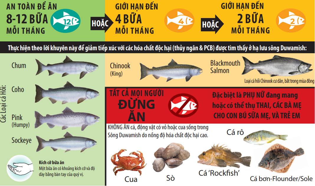 - Chỉ ăn cá hồi trong những loại hải sản từ Sông Duwamish. Đừng ăn những loại hải sản đã sống cả đời trong Sông Duwamish như cá rô, cá bơn, cua, chem chép, và sò.