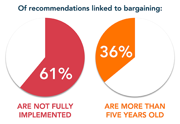 At the time of our 2020 Law Enforcement Audit Program report, 61 percent of bargaining-related recommendations were not yet fully implemented, despite many of them having been made more than five years previously. It will be necessary for leaders to work proactively to ensure that the recommendations are implemented in a timely manner.